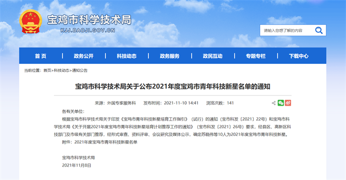 近日,寶雞市科學(xué)技術(shù)局公布了2021年度寶雞市青年科技新星名單,我公司研發(fā)中心主任張永春成功入選!